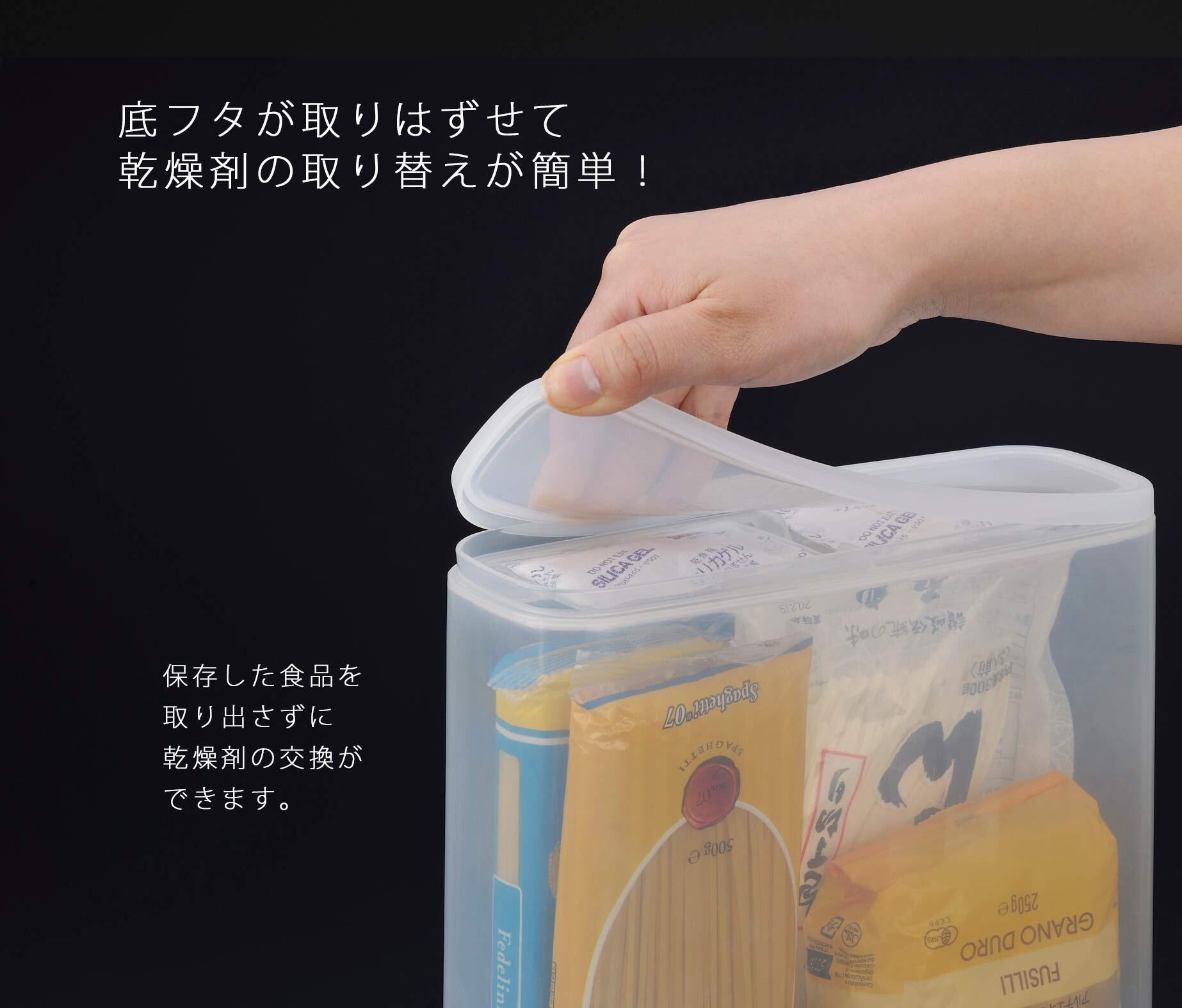 ●湿気を嫌う食品の保存・収納に。●スリムタイプだから中身が見やすく、持ちやすい●出し入れもスムーズで見た目もスッキリ●乾燥剤は本体と底ブタの間に入っていますので、食品をいれたまま乾燥剤の取り出し、取付けができます