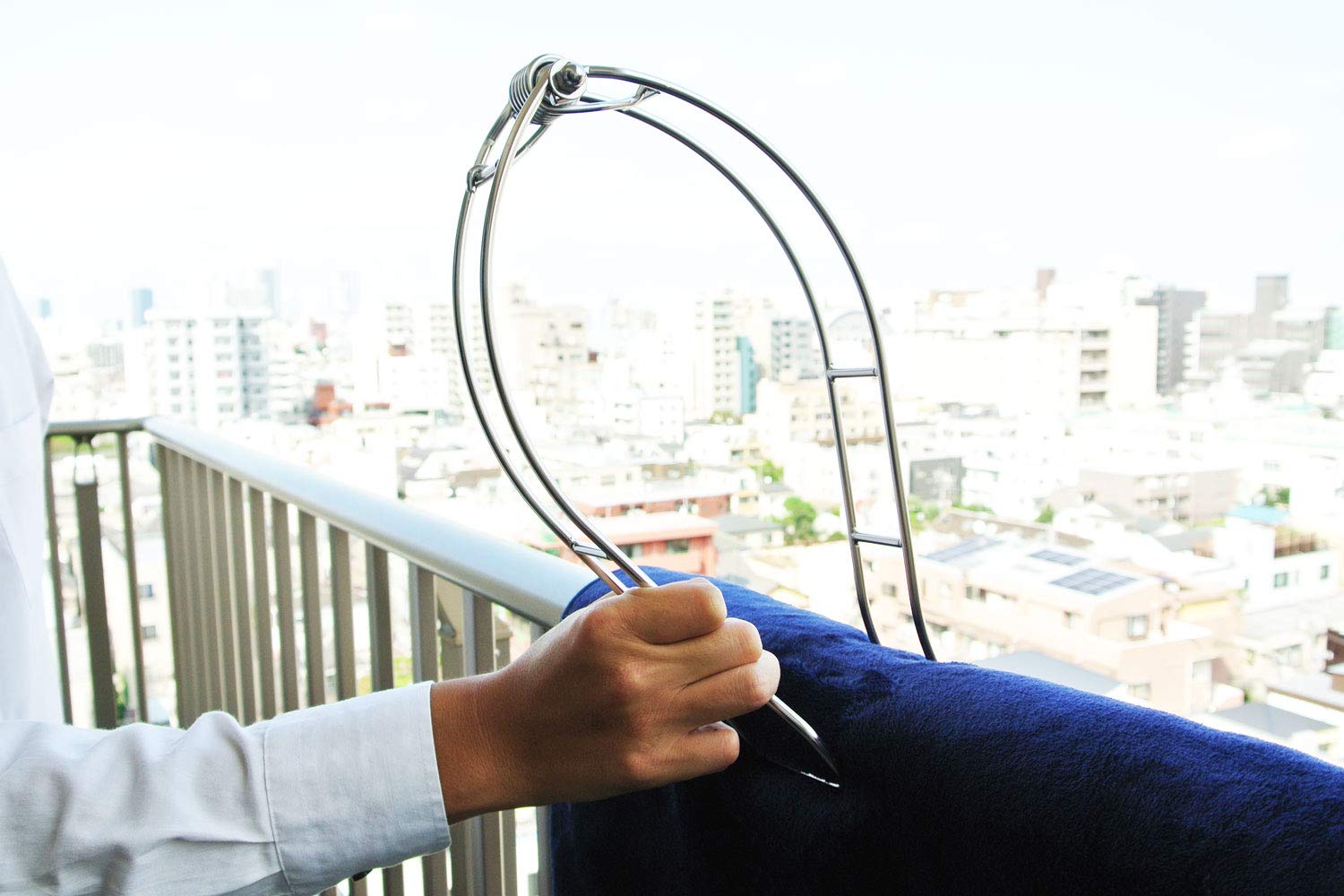 ふとんばさみを片側長くすることで、弓矢のように引き当てて広げられます。スプリングまですべてステンレス製で作ることで劣化の心配がありません。
