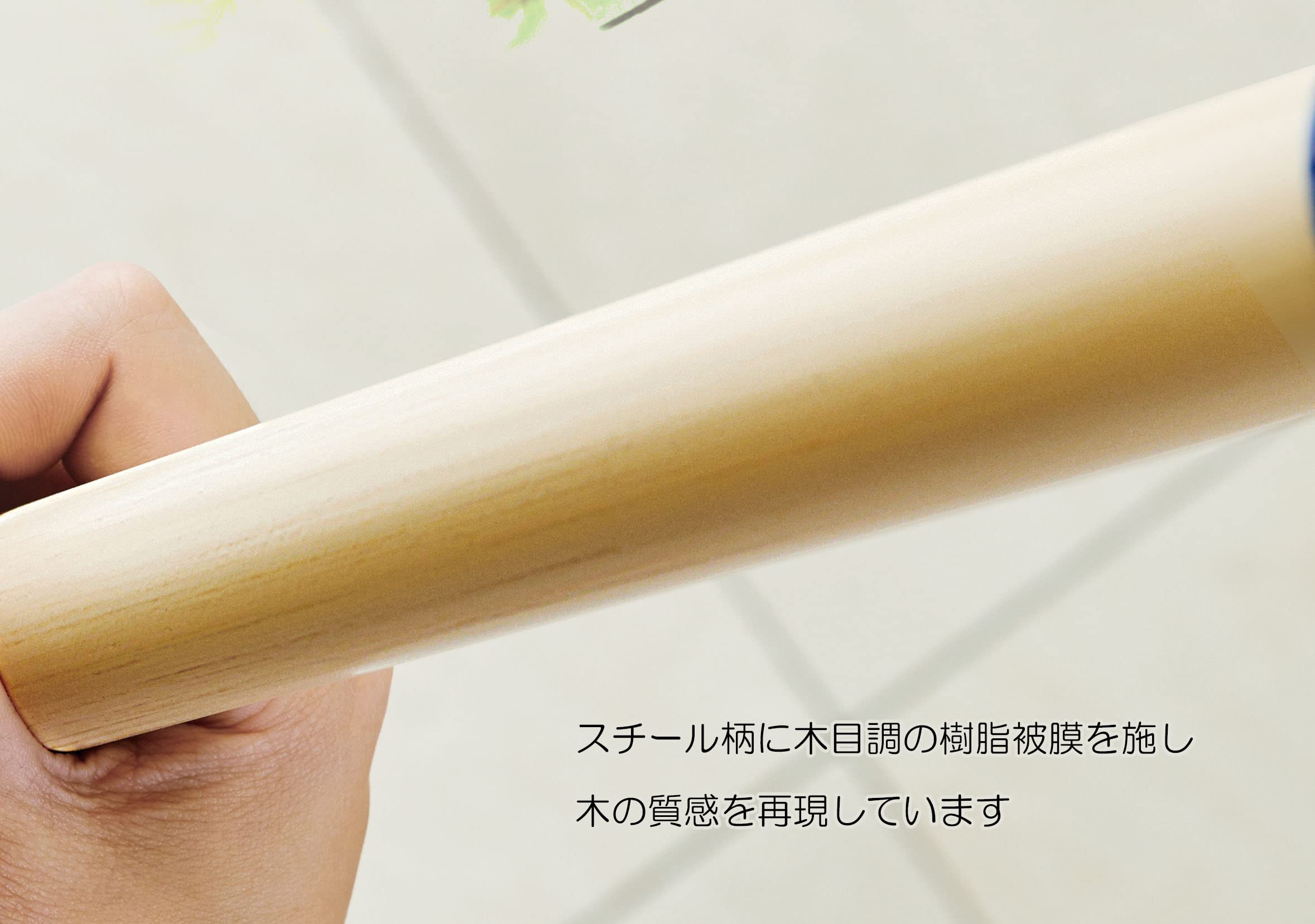 スチール製の柄には木目調樹脂被膜を施しており、木の質感を再現いたしました。