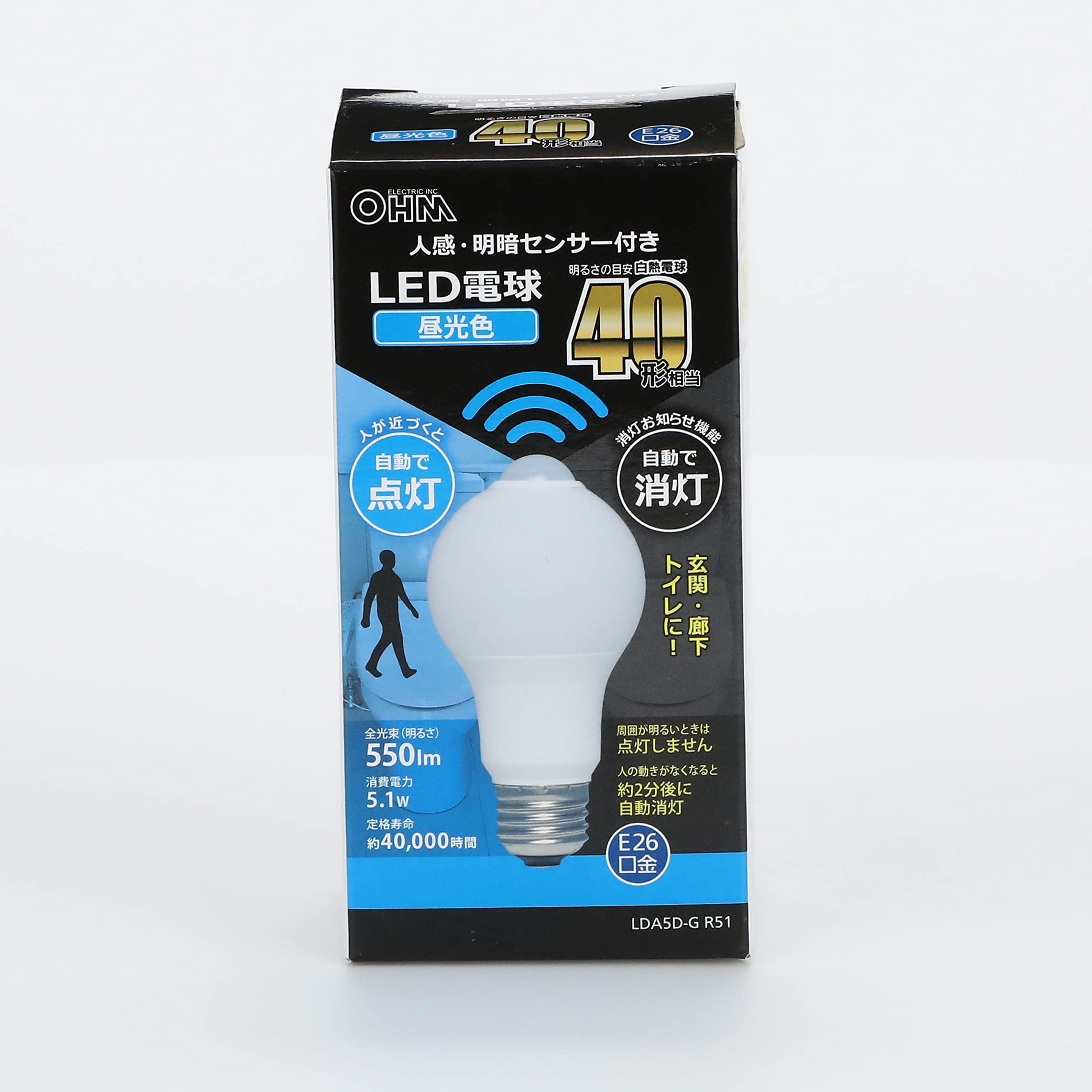 オーム(OHM) 電機 LED電球 E26 40形相当 人感明暗センサー付 昼光色 人感センサー 40ワット相当 自動点灯 玄関 トイレ 廊下 階段 LDA5D-G R51 06-4464