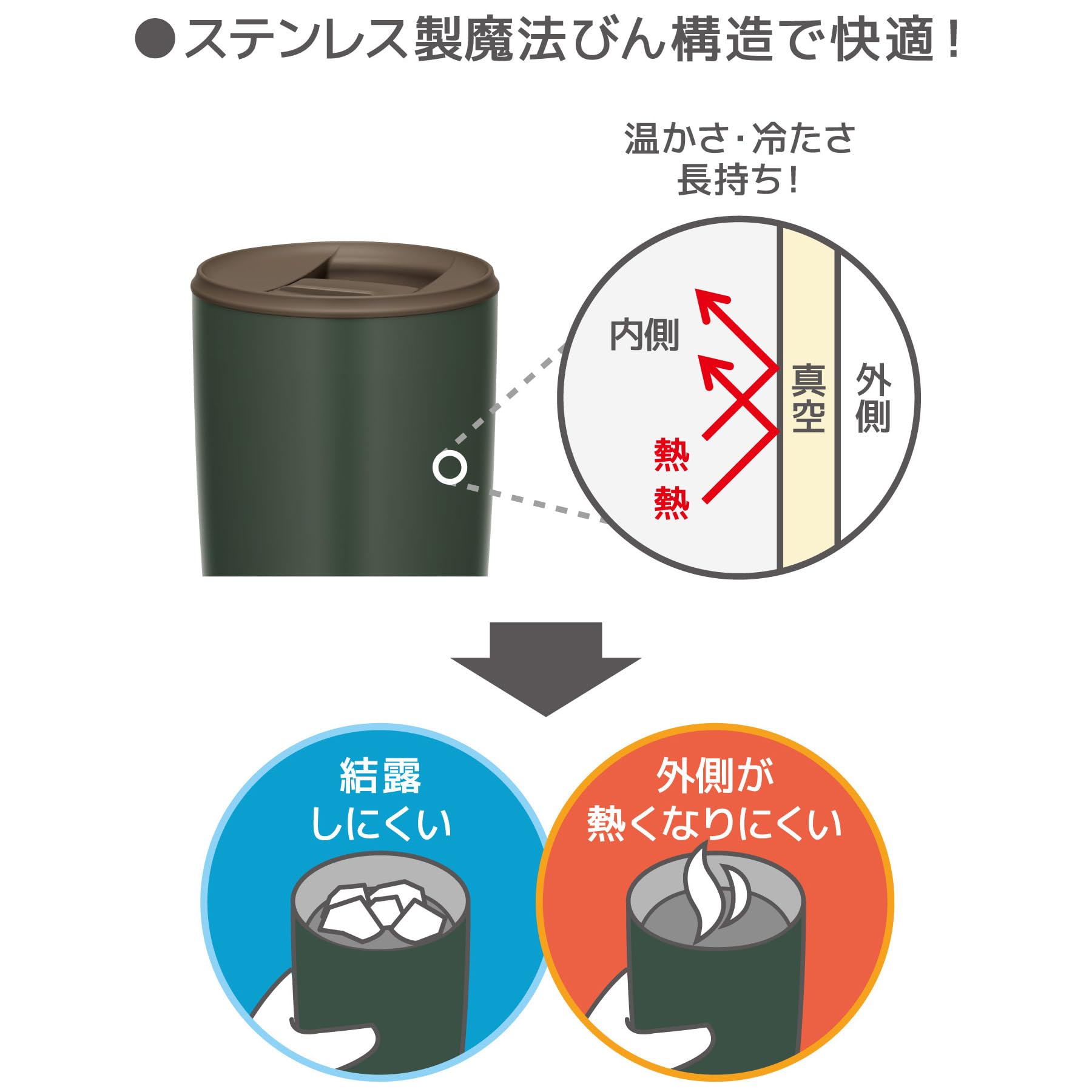 ●ステンレス製魔法びん構造で温かさ・冷たさ長持ち